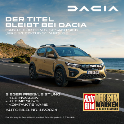 Über alle Modelle: Bei der Leserwahl „AUTO BILD – Die besten Marken in allen Klassen“ hat Dacia den Gesamtsieg in der Kategorie „Preis/Leistung“ gewonnen. AUTO BILD Ausgabe 16/2024.